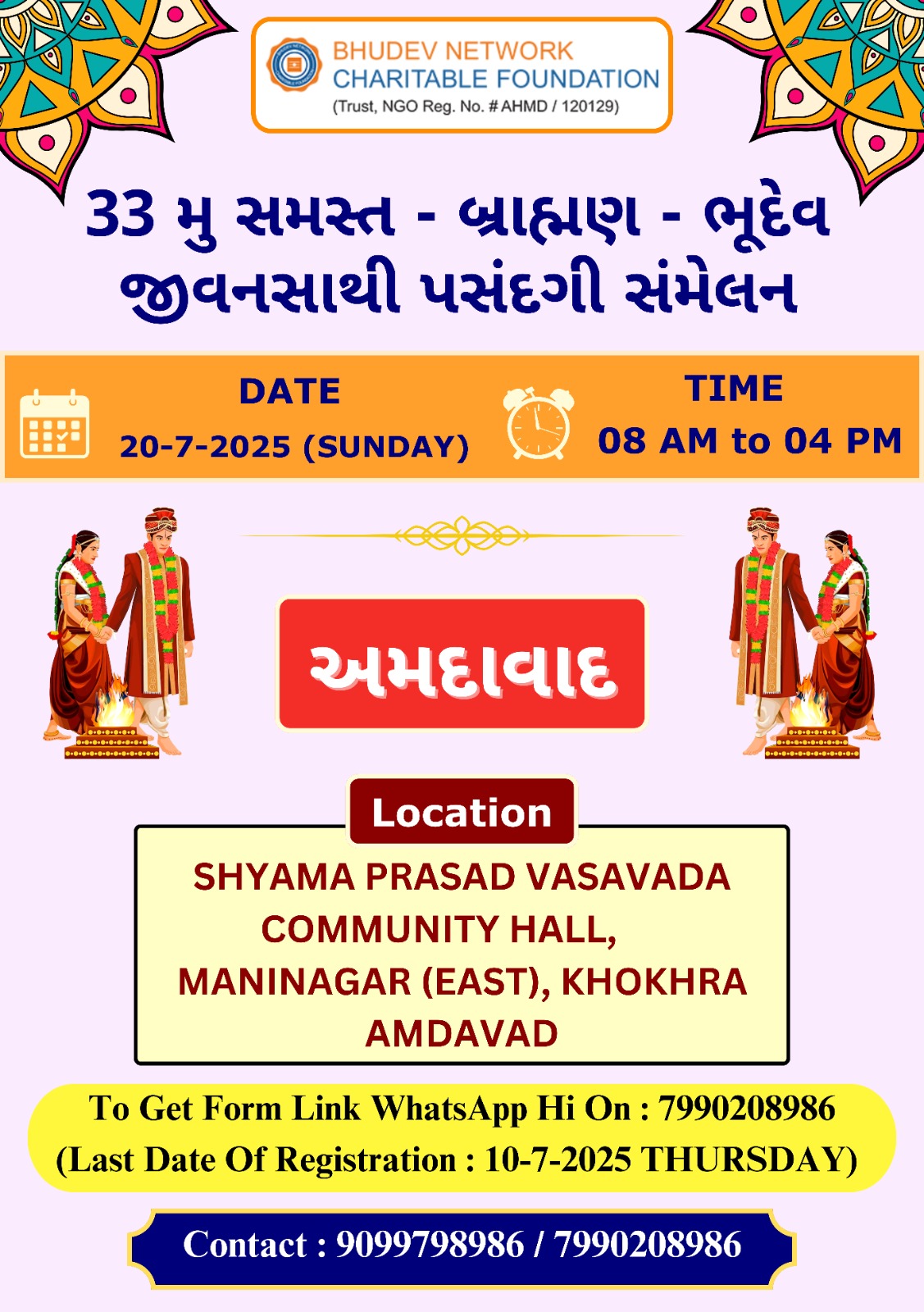 તા. 20-07-2025 ને રવિવારે 33મુ Mega ભૂદેવ જીવનસાથી પરિચય સંમેલન - અમદાવાદ માં // Online બાયોડેટા રેજીસ્ટ્રેશન છે // Last Date for Online Biodata Registration : 10-07-2025 (Thursday)